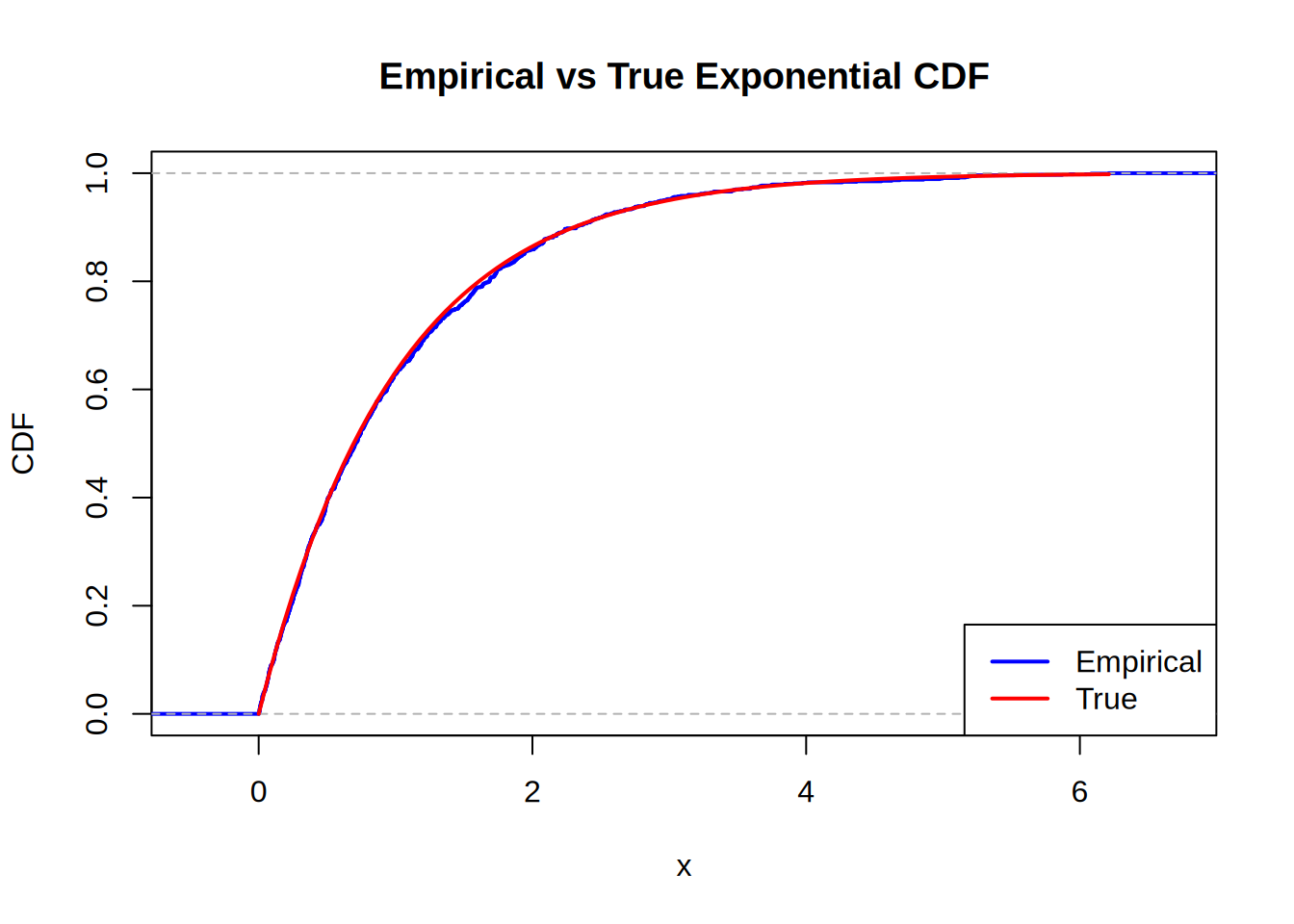 plot(ecdf(X), main = "Empirical vs True Exponential CDF", xlab = "x", ylab = "CDF", col = "blue", lwd = 2)