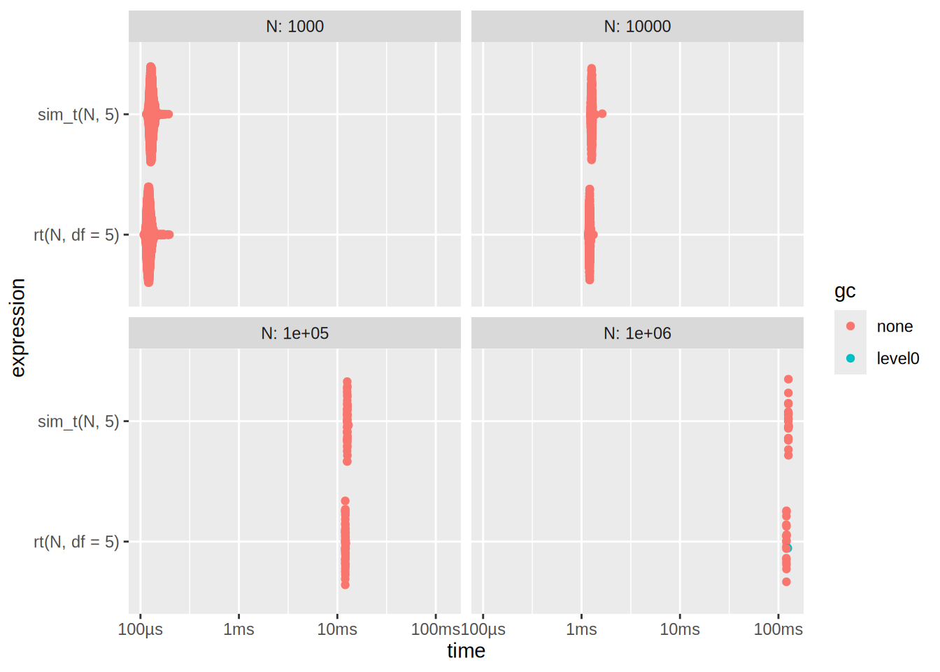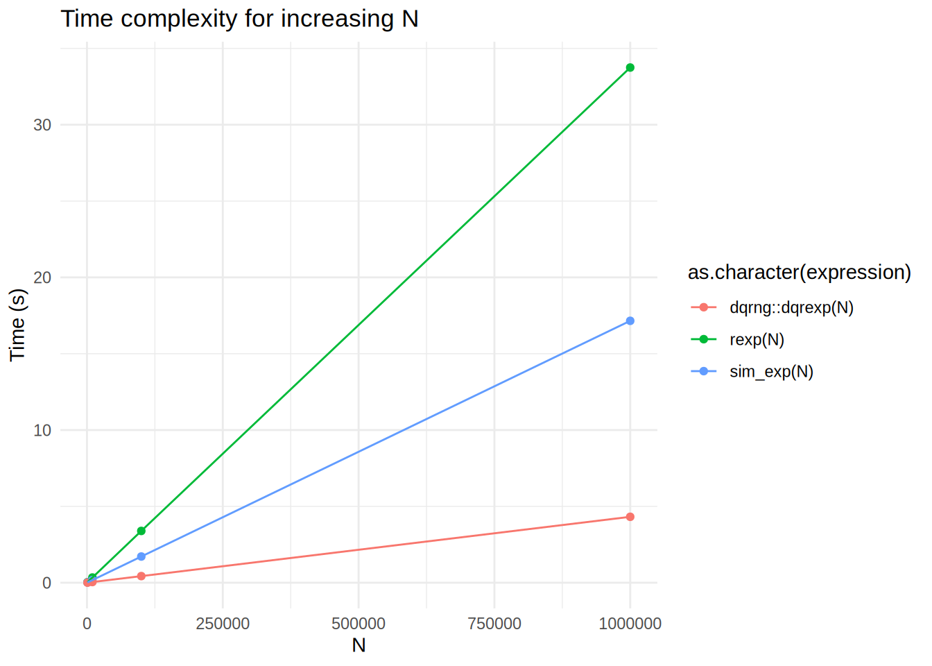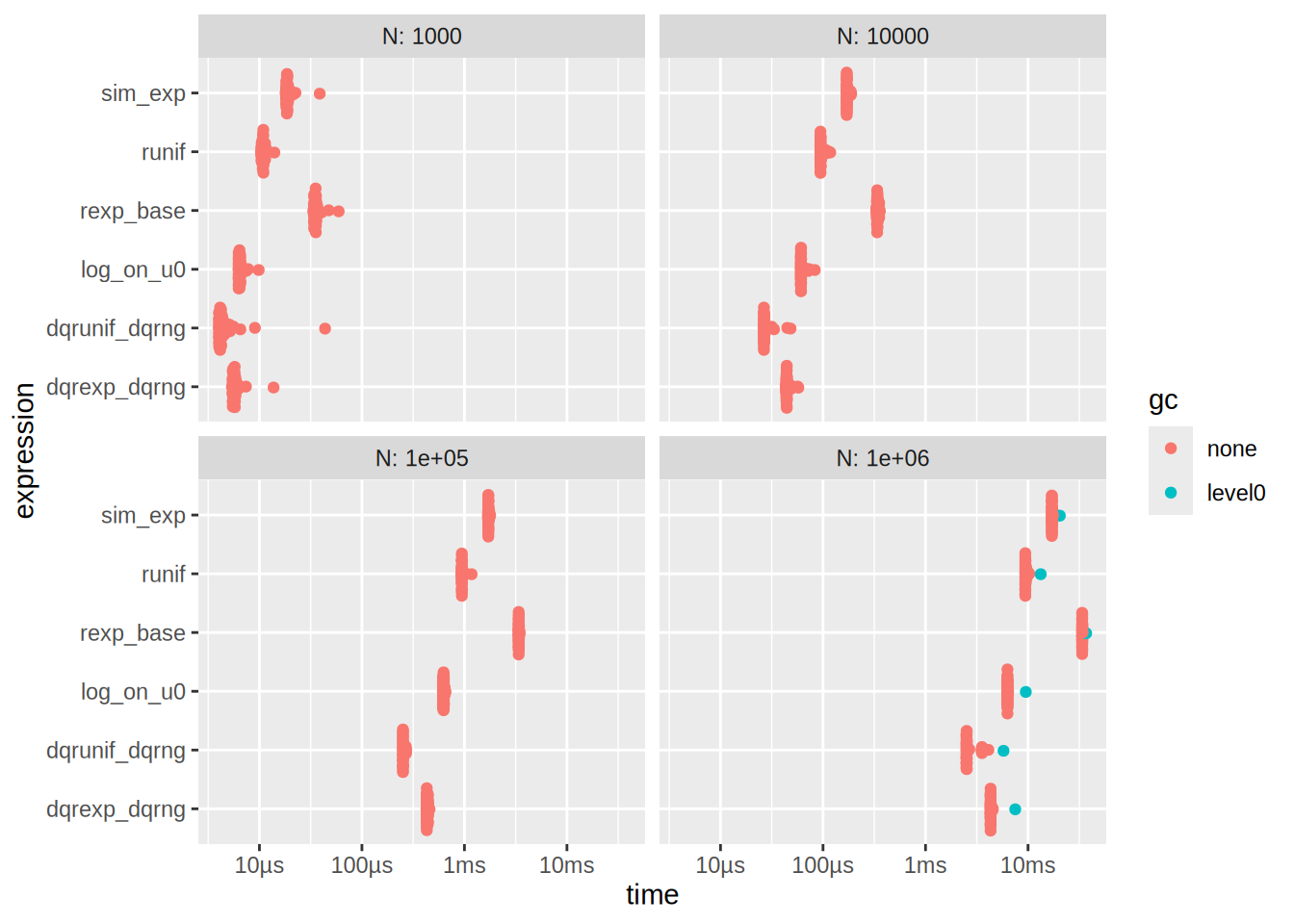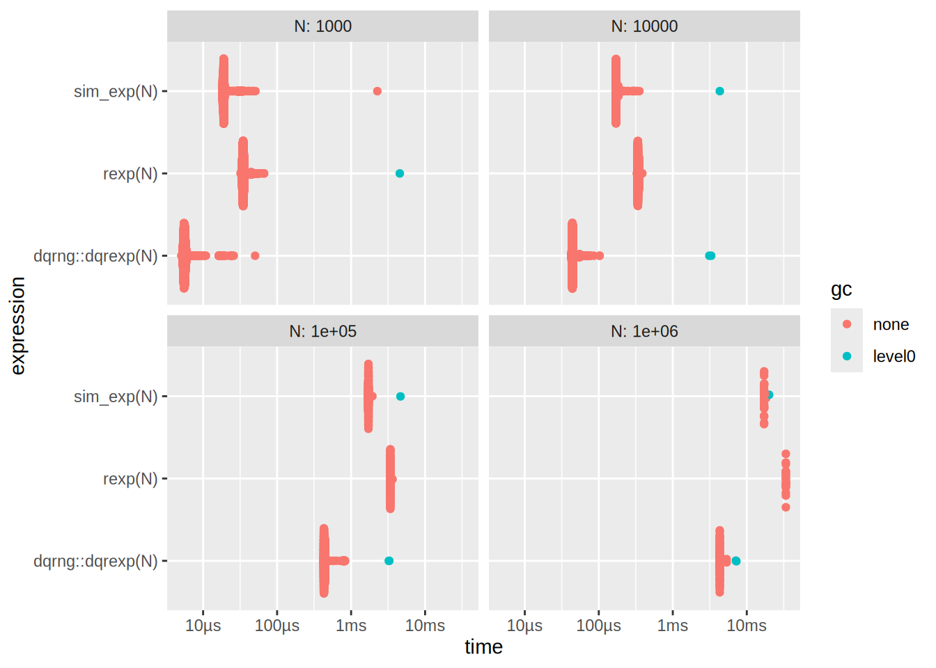 On my MacBook Pro with M2 Pro chip, I get that the sim_exp is much faster than rexp which is in turn slightly faster than dqrexp. If you are viewing this exercise on the website, you might see different results due to the different hardware that GitHub CI uses. It is quite difficult to exactly pinpoint the reason why sim_exp is faster than rexp and dqrexp, but it is likely some combination of hardware (running apple silicon) and tooling (compiler differences, R software version, etc.). This is a good illustration of premature optimization. If I had implemented all my functions using dqrexp on my MacBook Pro, I might have optimized the wrong thing and lost performance.