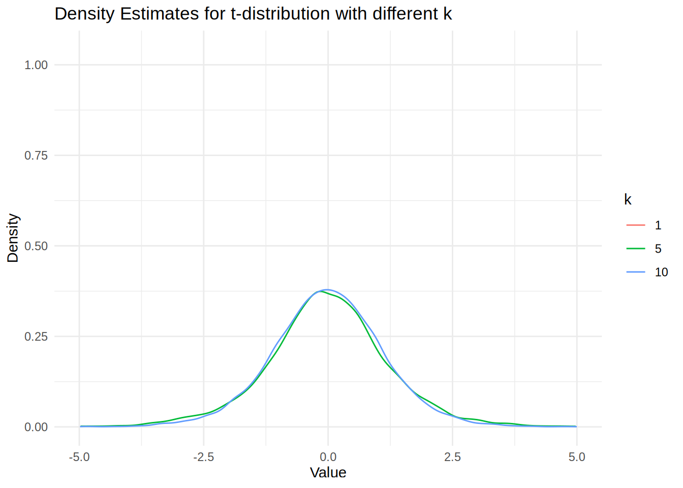 We see that the density estimate for k = 1 is not showing because the t-distribution is very heavy-tailed, which produces extreme outliers that cause the density() function’s automatic bandwidth selection to fail and create numerical instabilities in the kernel smoothing process. The numerical issue arises because the density() function uses automatic bandwidth selection methods (like Scott’s rule or Silverman’s rule) that assume the data has finite variance. However, the t-distribution with k = 1 degree of freedom has infinite variance, causing extreme outliers that fall far outside the typical evaluation grid used by density().